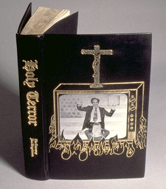 The first foil stamped photograph on leather. Richard Minsky is the televangelist exhorting on the book cover, and Joni Mabe is the supplicant praying or whatever it is she's doing there.