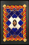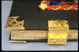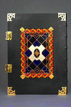 Richard Minsky has created many guest books for private homes, museums and heads of state. This book has front covers on both sides, as the Chateau receives visitors from countries which write in both Western and Eastern conventions. The central medallion represents the name of the Chateau in 11th century Mail (Arabic) calligraphy. A rough version was faxed to Normandy from the Levant and refaxed to Minsky's computer in New York, where he autotraced the bitmap into CorelDraw, converted it to Bezier curves, formed it into a logo, printed it on an ink jet, had a magnesium die made of it, made a latex mold of the die, made wax castings in the mold, which were lost wax cast in Vermeil, and painted in the transparent enamels to get the effect you see here. The heraldic emblems in the bosses and clasps represent the owner's family history. Minsky sculpted all the hardware in wax for the casting.