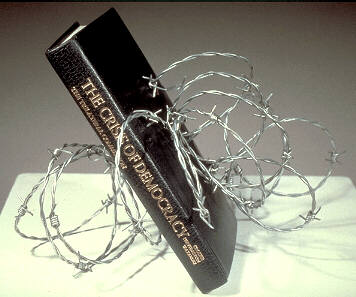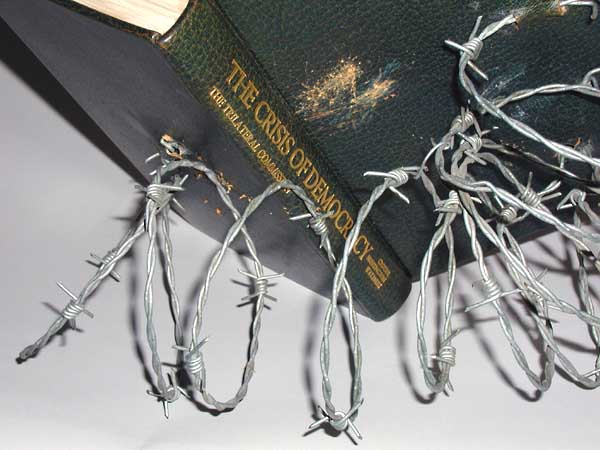 The barbed wire springs back to form a reading stand.The authors propose that there is too much freedom in contemporary democracies, and that it is necessary to curtail personal freedoms in order to preserve the governability of democracies. In 1980 the choice in the USA presidential elections was of three teams, all of which included at least one member of the Trilateral Commission, an organization founded in 1973 by David Rockefeller and Zbigniew Brzezinski. I exhibited this book as a political commentary, choosing the materials to reflect the metaphor of the text.