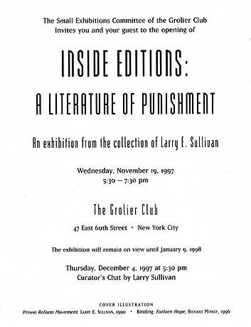Invitation to Inside Editions exhibition opening at The Grolier Club, November 19, 1997. 7 1/4" x 5 1/2"