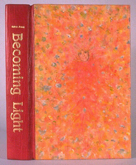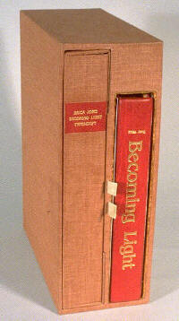 Binding includes back cover and spine in Nigerian goatskin, with a 23k gold stamped title. The front cover is a lacquered panel of acrylic over a photo of the author. The binding has a paper chemise which slides into a velvet lined double slipcase. The original typescript is in the other side of the slipcase, in a folder with Velcro closures. The inside of that part of the slipcase is paper lined, and has recesses for the flaps of the folder.