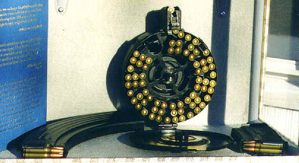 Above the books is a Norinco MAK-90 Sporter, a semiautomatic version of the AK-47 assault rifle. Also in the case are 1,000 rounds of ammunition, two five-round hunting clips, a loaded 40-round "banana" magazine, and loaded 75-round drum magazine.