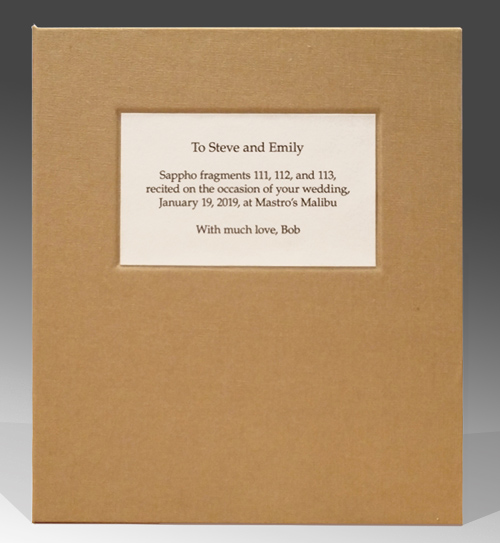 A first wedding anniversary gift from Robert Ball, Professor Emeritus of Classics, University of Hawaii, to Emily Smith Guttenberg and actor Steve Guttenberg. Prof. Ball recited the Sappho fragments at their wedding in English translation. The diptych features his reproduction of the original Greek fragments, printed on papyrus, with his translations of the fragments on the facing panel, printed on Rives paper.