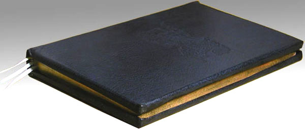 Midnight blue goatskin, blind stamped front and back covers, 23K gold title on spine. Extended leather edges wrap 5/16". Page edges finished with Armenian bole and 22K gold leaf. Commissioned by Molly Sacamano.