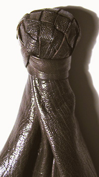 In actual use the book hangs from a belt, with the knot on top securing the book.