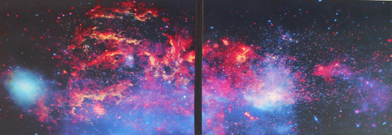 Michigan. The basis of the cover panel is the "Big Dipper," one of the most familiar celestial markers, part of the constellation Ursa Major. It has been used for millenia by explorers because the front two stars in the "bucket," Merak and Dubhe, point to Polaris, the Noth Star, which is the end of the handle in the "Little Dipper" in the constellation Ursa Minor. The design began with a tracing of the positions of the brightest stars in these constellations, and choosing brass tools for dots in sizes that represent the relative magnitudes of the stars. The letters AA are are like two spaceships traveling together through the universe. They start from a familiar place, gold in the bucket of the big dipper. The star chart is a metaphor for the newlyweds to navigate together through the vastness of the unknown. There are many distractions and destinations, represented by three stylized stars in abalone shell and three planets in goatskin. The materials of the cover are from the animal and mineral kingdoms, with the vegetable kingdom represented by the binders' board that is under the skin, the flour paste that attaches the skin to the board, the linen thread and tapes the book is sewn with, and the 100% cotton Rives BFK paper of the book. The three kingdoms work together, and if properly cared for the book can last a thousand years or more. The triangles made by the planets and stars intersect, and are in illusionistic deep space. When imagined in three dimensions, there is a place where the configuration can be viewed as a Mogein Dovid (Magen David), the Star (Shield) of David, a symbol of Jewish identity. Because of the way the abalone reflects light and color, and the tooling of the dots at different angles, the cover elements light up in changing ways depending on the viewing angle and light source. Endpapers were created by combining NASA images of galaxies and nebulae in Photoshop, printing the composite on an Epson R1900 in Ultrachrome II archival pigment inks, and spraying the image with two coats of lacquer, with the topcoat satin finish. The hinges are bookcloth. ![]() Endpapers. Above: front. Below: back